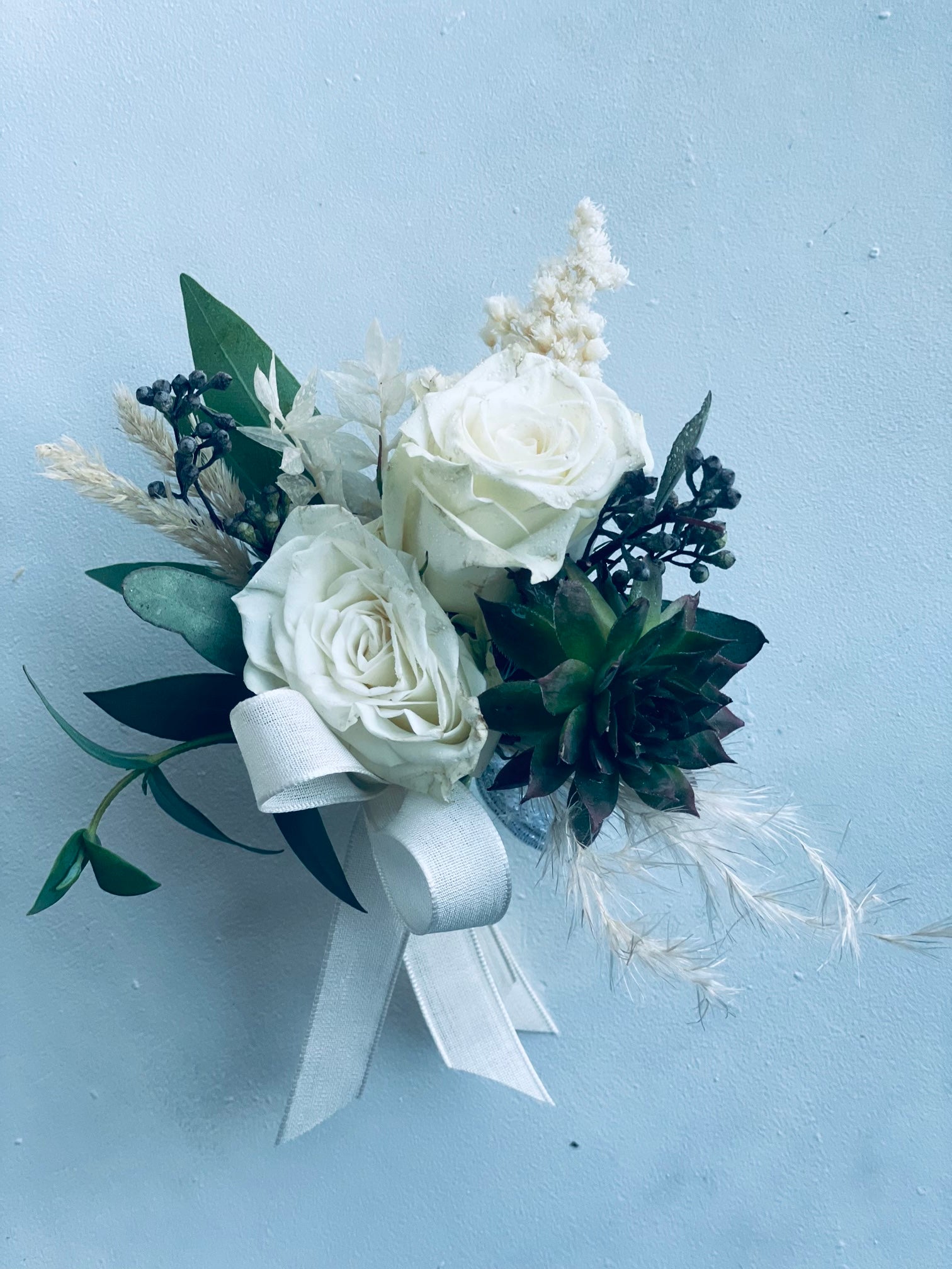 White Spray Rose Corsage With Succulent